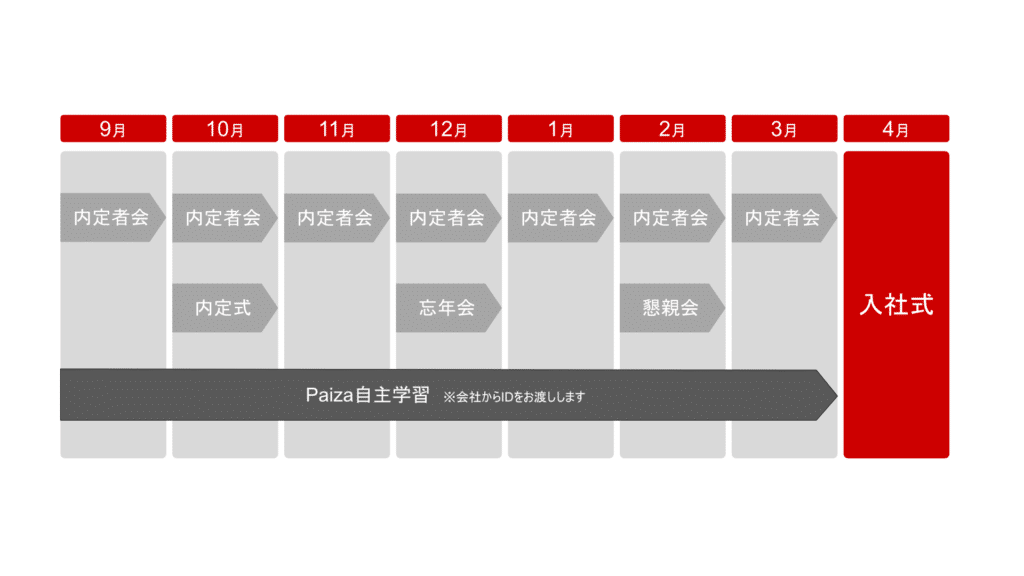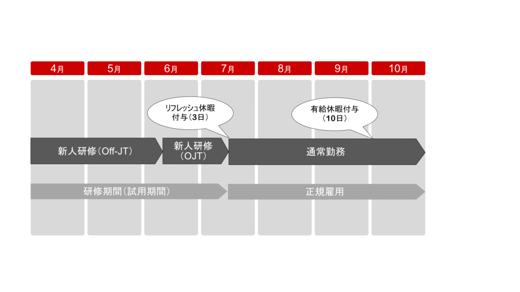 • 研修期間は試用期間として扱い、有期雇用契約を適用します。新人研修(訓練受講)などを正常に満了した後に正社員への転換をします。