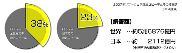 BSA(Business Software Alliance)による調査では、2007年の全世界での違法コピー率は対前年比3ポイント増の38%、損害額は21%増の約482億ドル(約5兆6876億円)、日本での違法コピー率は23%、損害額は約2,112億円(全世界での損害額ワースト9位)に及ぶと報告されています。