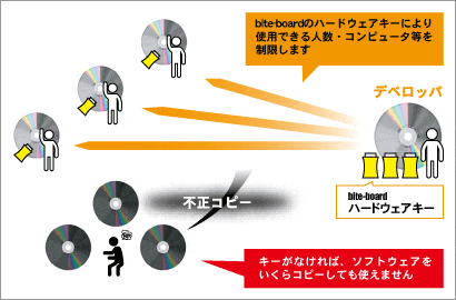 PCのUSBポートやパラレルポートなどに接続するハードウェアキーを利用したソフトウェアプロテクションシステム「bite-board (バイトボード)」は、CD-ROMにガードをかけたりインストールプログラムで複雑な制御をするといった必要はなく、お手軽にソフトウェアの不正使用を防止します。
