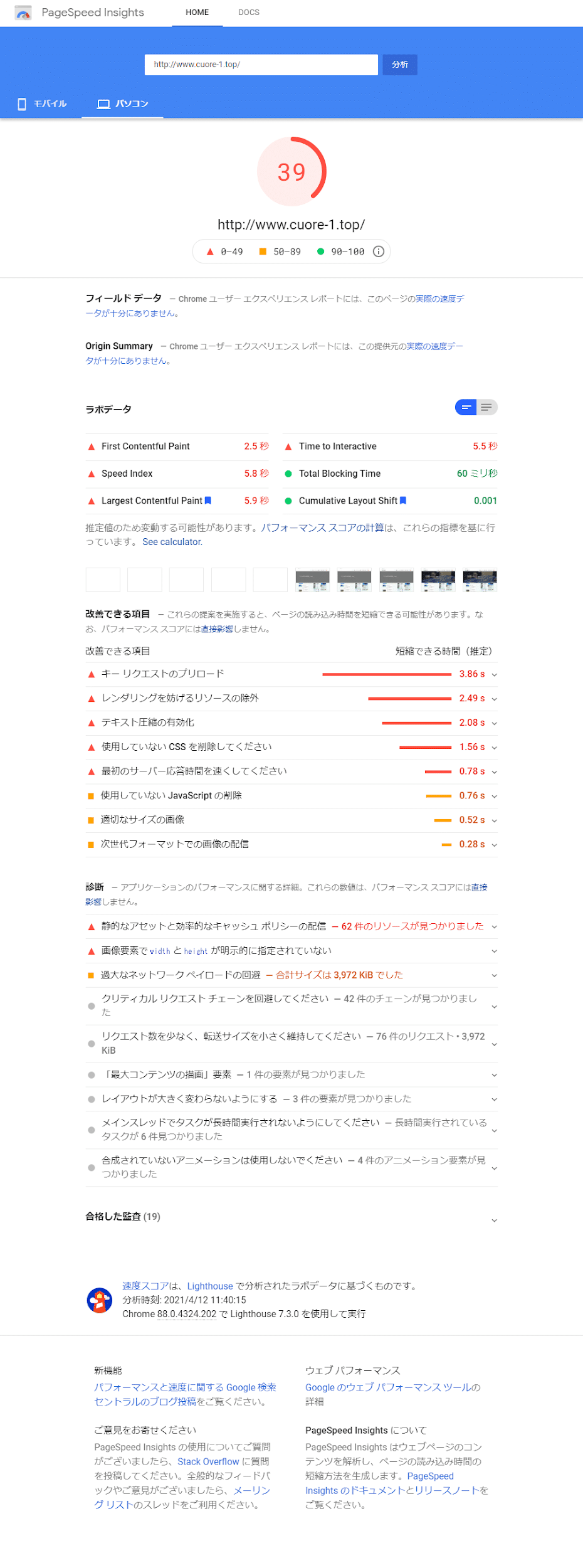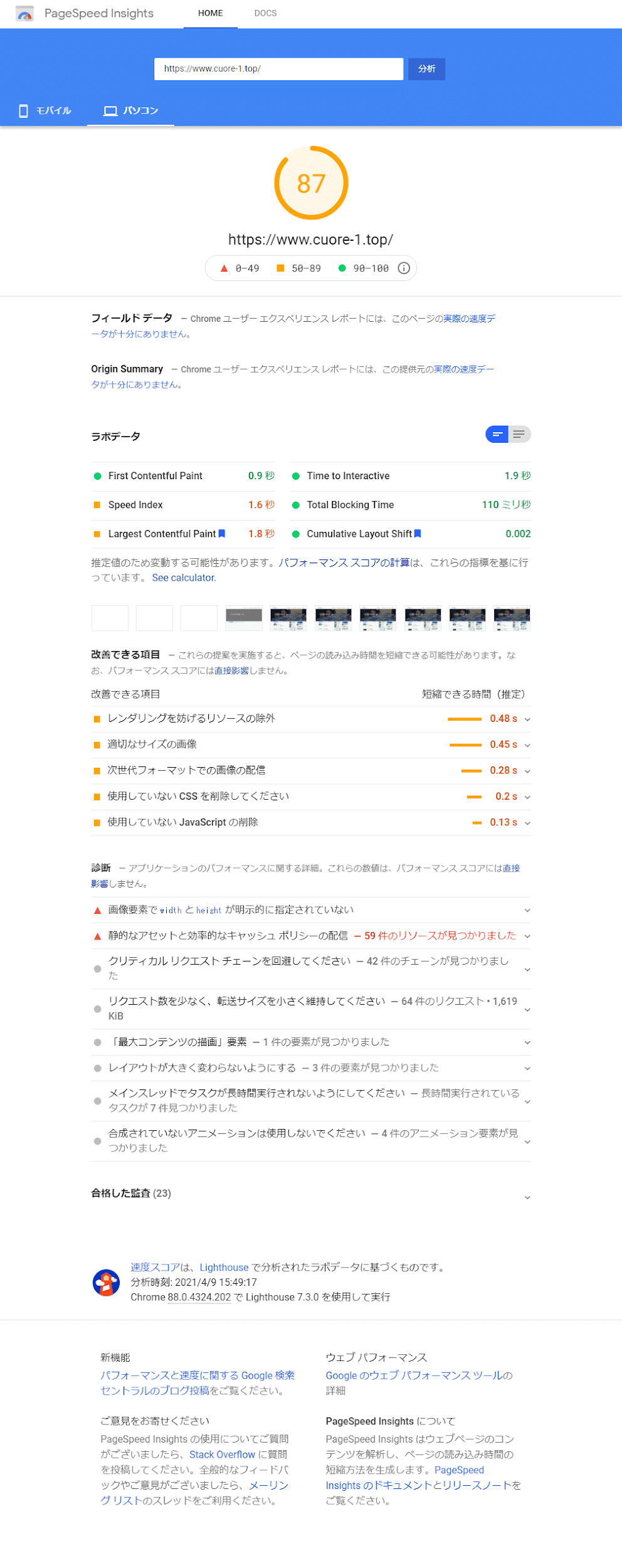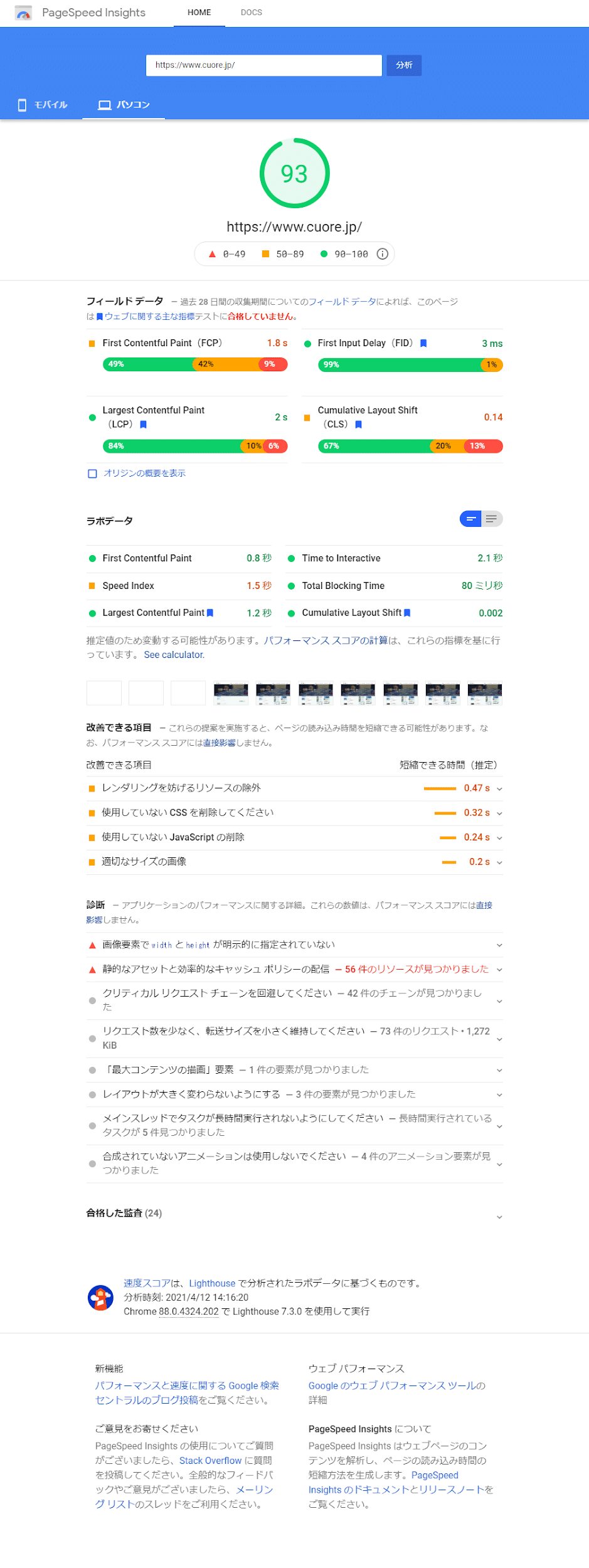PageSpeed Insightsの結果