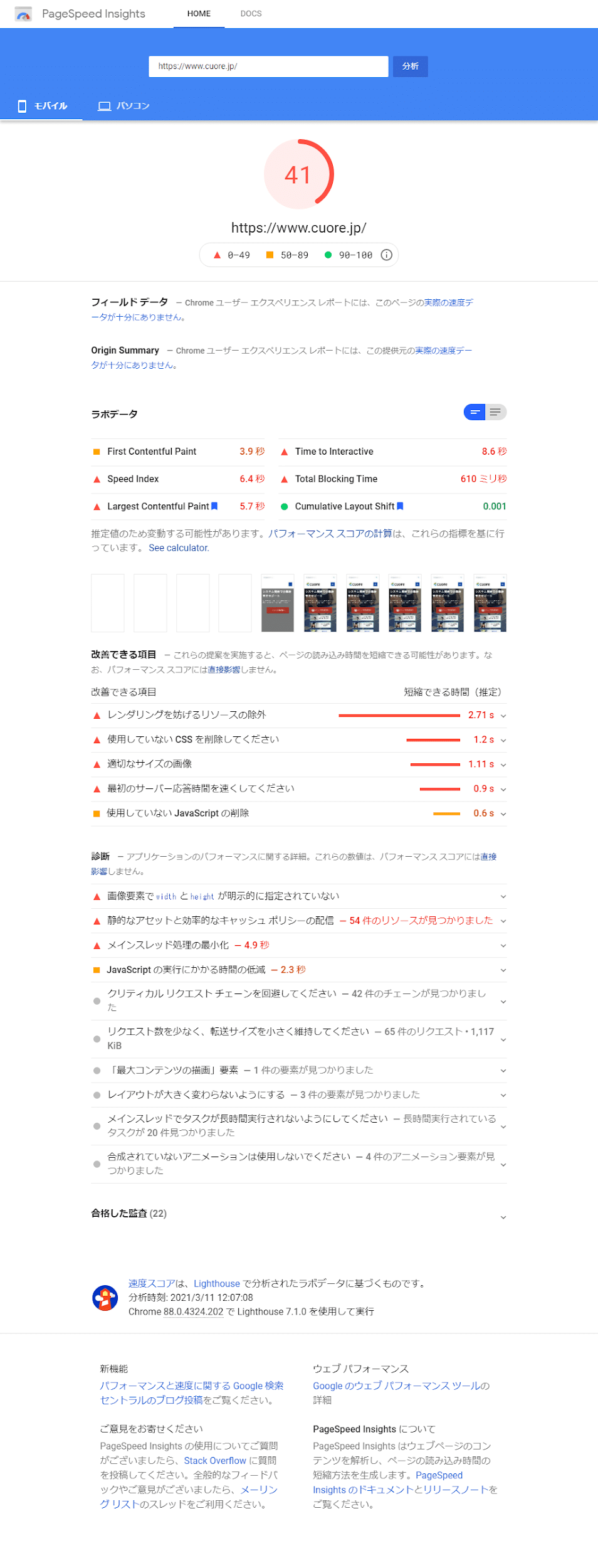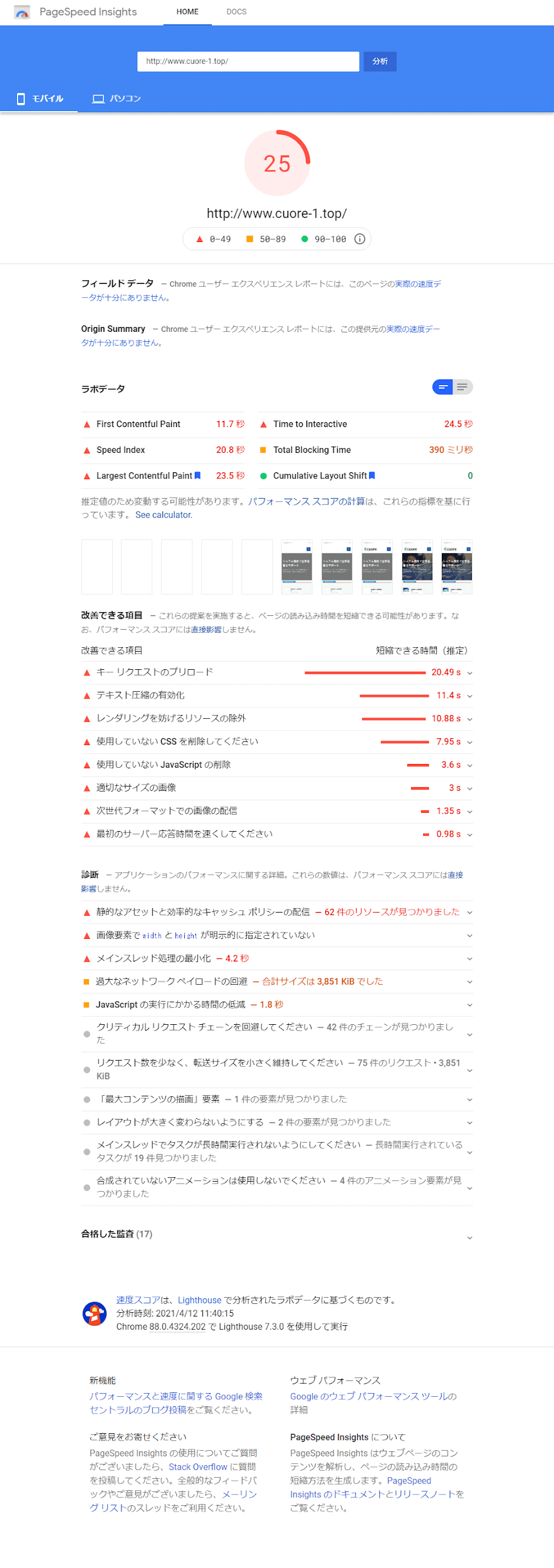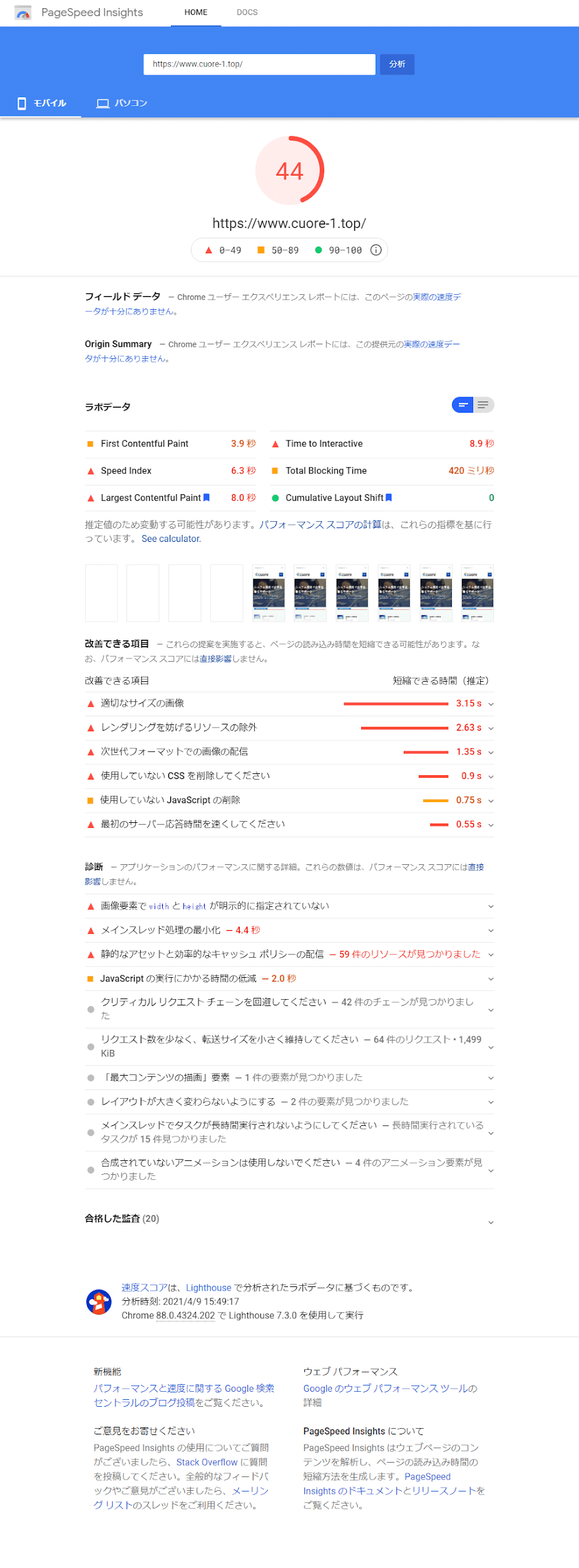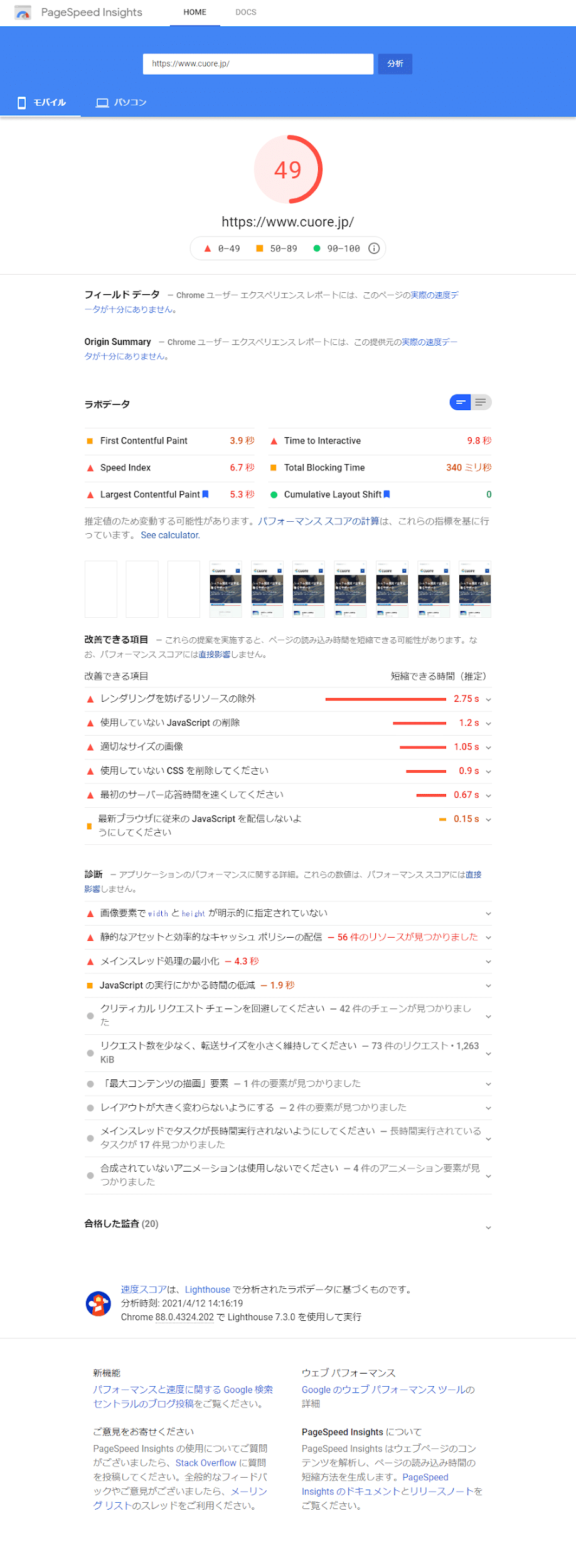 PageSpeed Insightsの結果