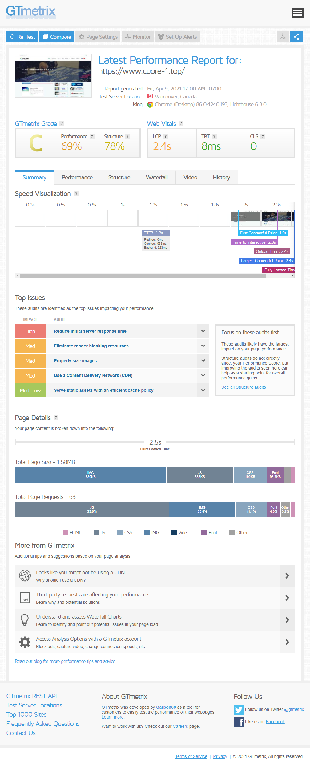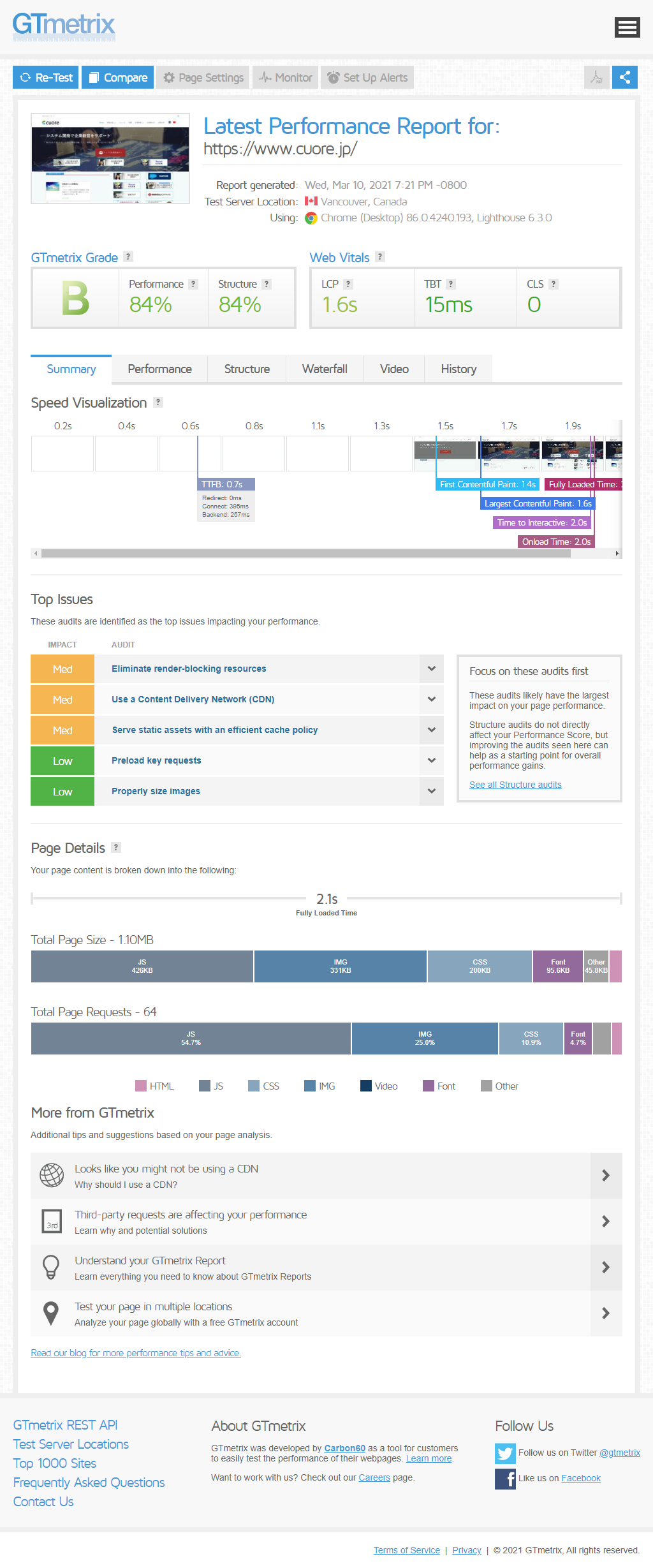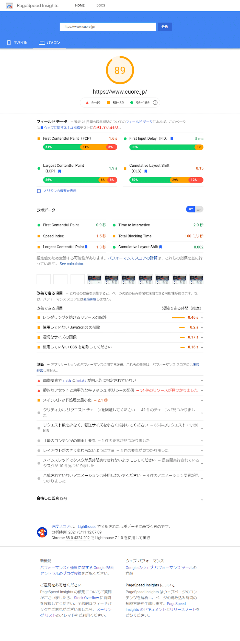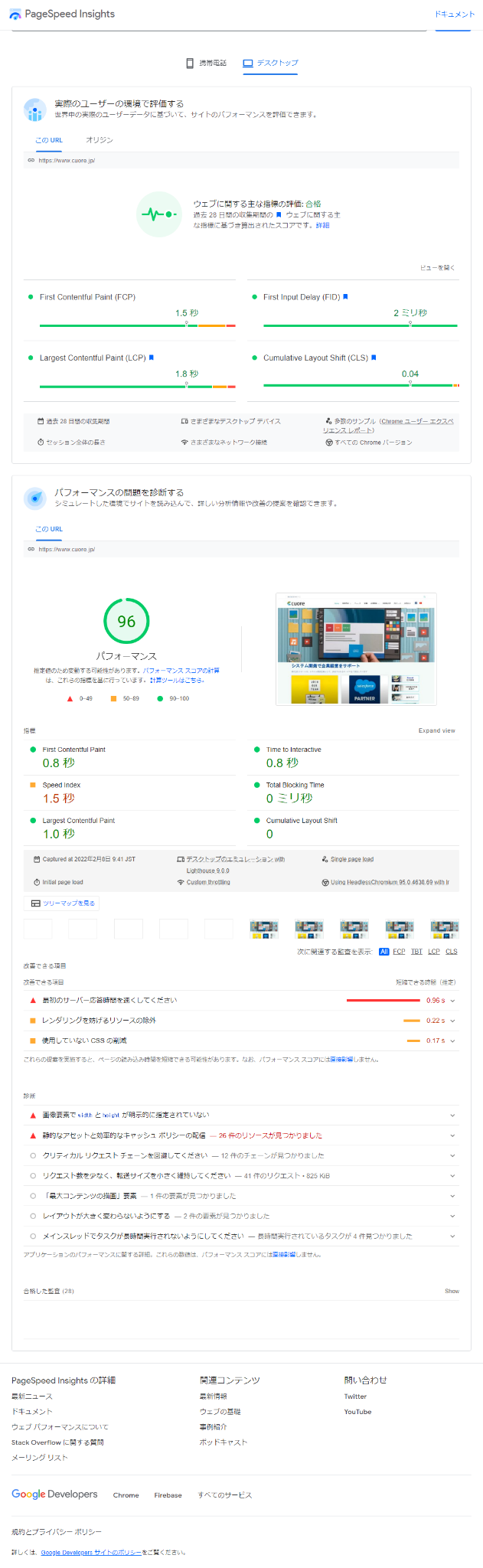 PageSpeed Insightsによりパフォーマンス対策を行なった。