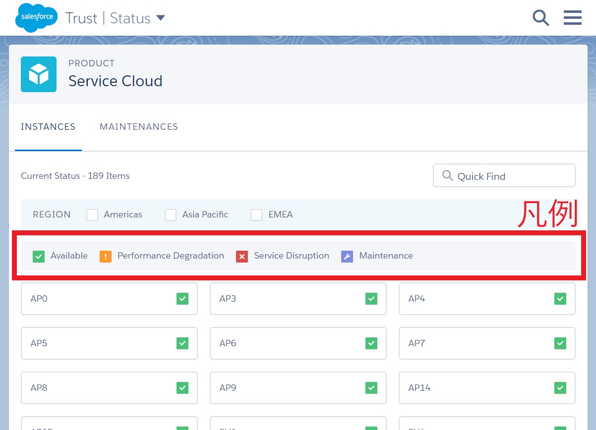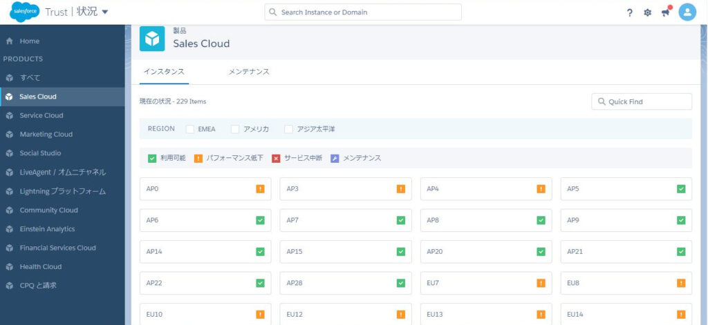 REGION欄ではインスタンスが提供されている地域で絞り込みができますので、日本で利用しているSalesforceなら「Asia Pacific」にチェックを入れて絞り込むと見つけやすくなります。