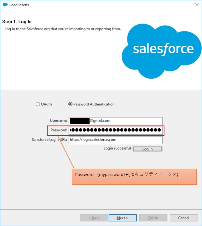 今後はセキュリティトークンを使うことがある場面が多いと思いますので特にこだわりや指定がないのであれば「Password Authentication」でログインすることに慣れておくといいかもしれません。