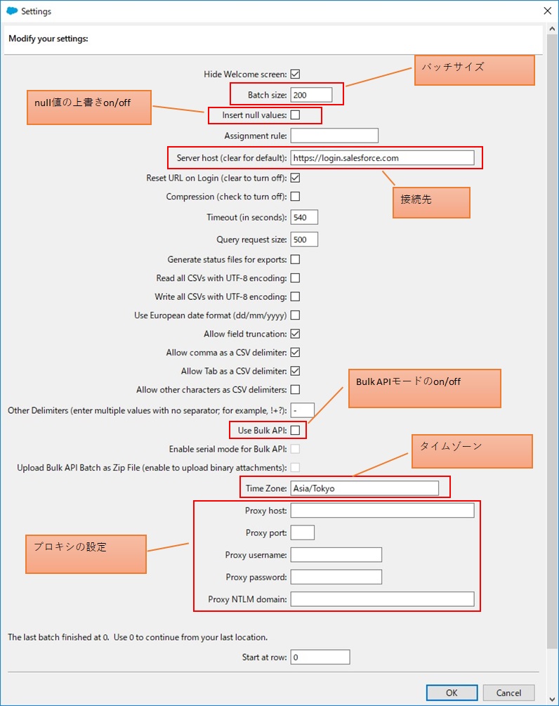 Dataloaderを実行するときに、各種セッティングできる内容があります。
