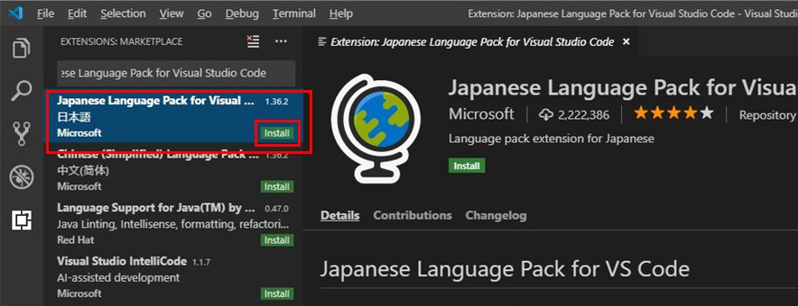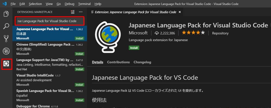 検索欄の下に表示された候補群から「Japanese Language Pack for Visual Studio Code 日本語」(おそらく一番上に表示されているはず)の緑字の「Install」をクリックしてインストールをする。