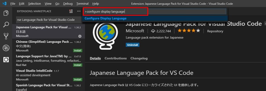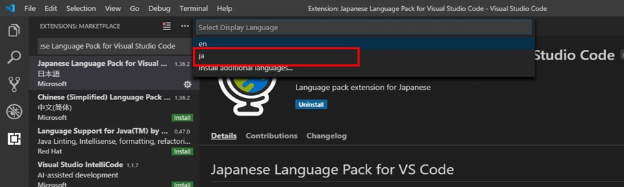 続けてコマンドパレット内に表示されている言語(en:英語、ja:日本語)の中から ja をクリックする。
