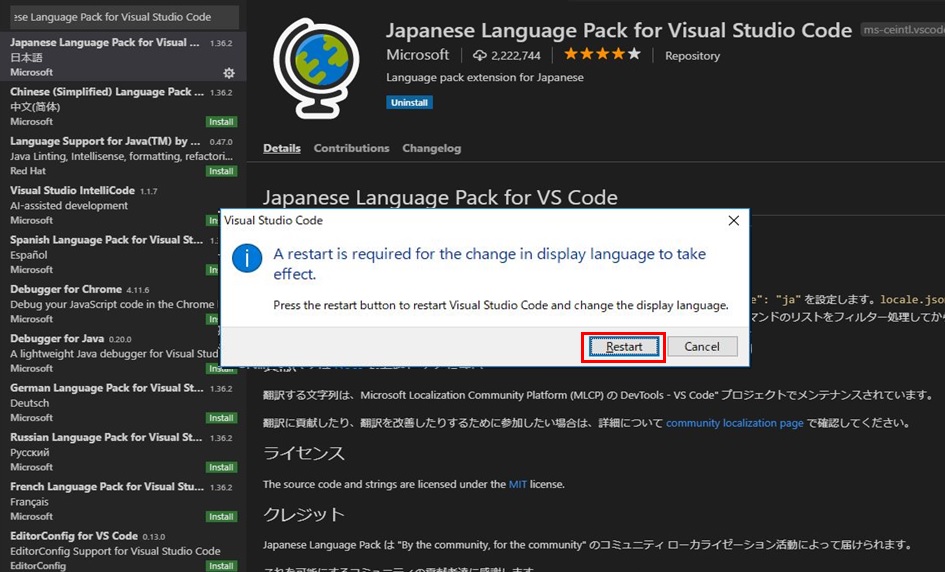 再起動を促すダイアログから(表示されなかった場合は手動で)VS Codeを再起動する。