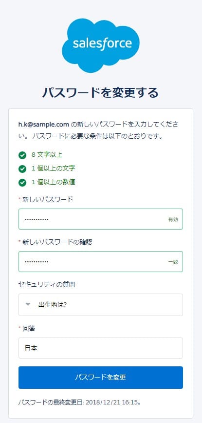 「新しいパスワード」と「新しいパスワードの確認」で入力した値が一致すると、入力欄が緑色で縁取られるので分かりやすいですね!