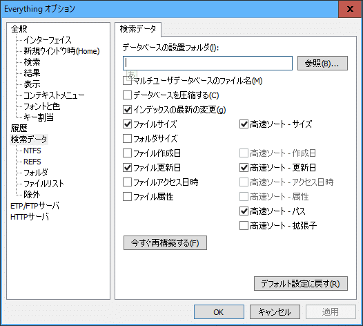 オプション画面(下記)の「検索データ」から検索する対象のドライブやファイルを指定します。