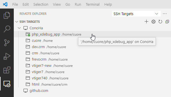 VS Codeの左のメニュー「Remote Explorer」でVPSへSSH接続する。