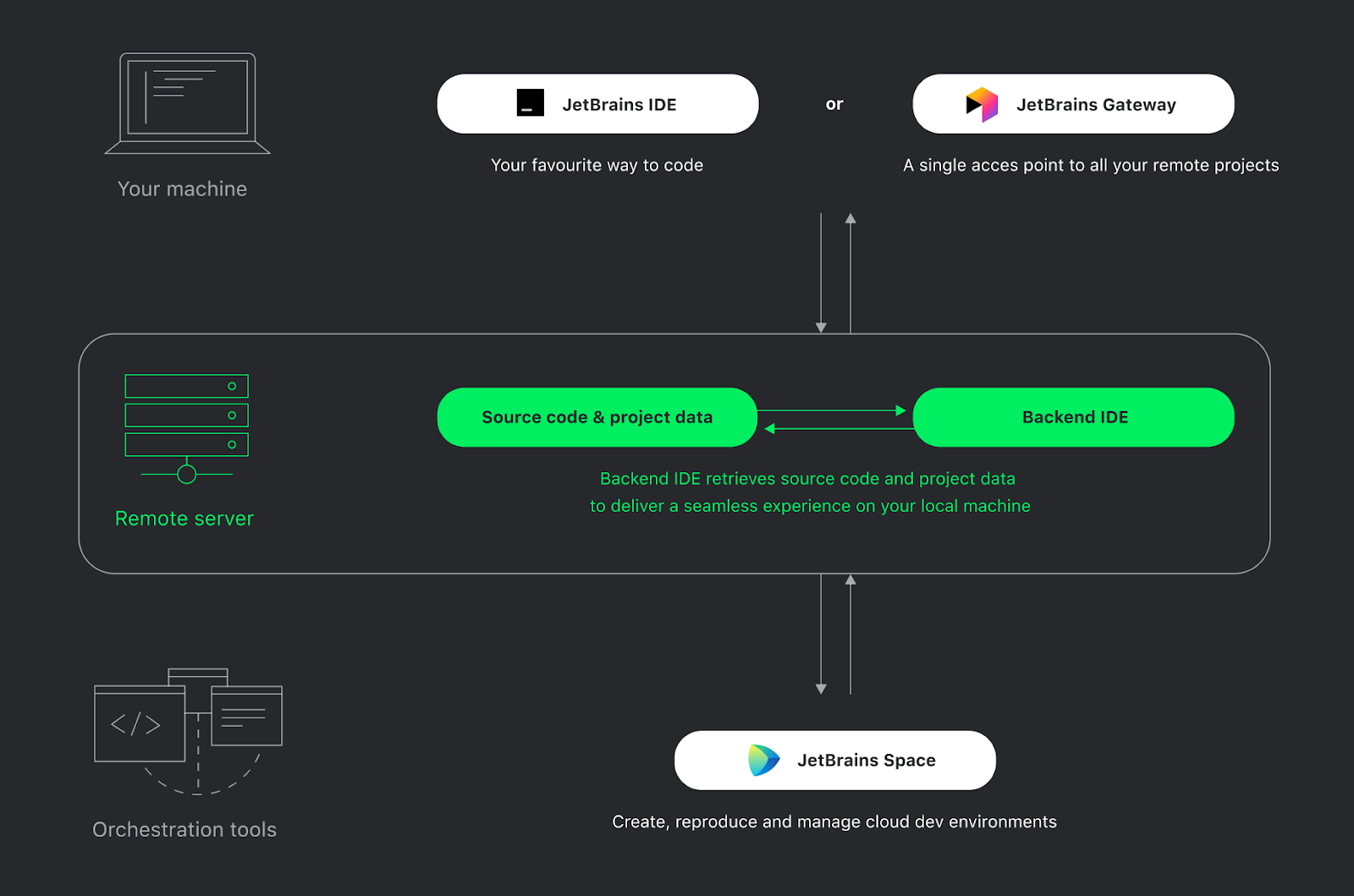 図ではJetBrains IDE or JetBrains Gatewayとなっており、必ずしもJetBrains Gatewayは必要でないように思えるが、これはIDEにJetBrains Gatewayの機能を持ったプラグインを入れた場合ということであるらしい。