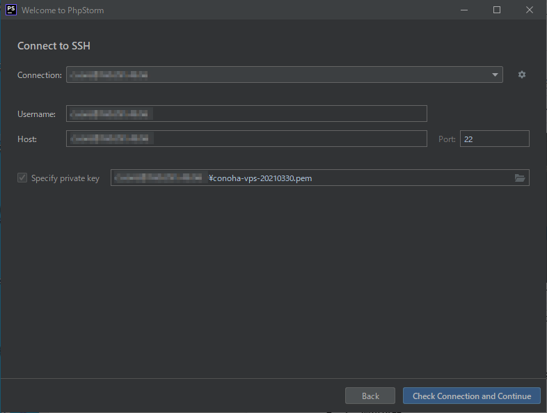 SSH接続のための情報を入力。電子証明書もConoHaから事前に落としたもの。