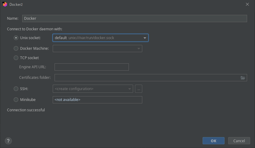 上記のServerの構成はConnect to Docker daemon with: 「Unix socket」。正常ならダイアログ下部にConnection successfullが出ます。